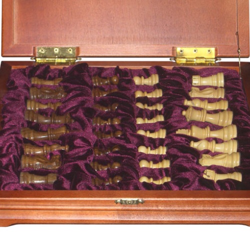 Фигуры выточены вручную: светлые из самшита, а темные из розового дерева. Высота короля - 2,75 дюйма (около 7 см). В основании каждой фигуры установлен утяжелитель, благодаря чему фигура увесиста и приятно лежит в руке игрока. Доска выполнена из массива березы. Размер доски 32 х 32 см. Поле набрано из попеременно расположенных квадратиков шпона березы (белые клетки) и ореха (тёмные клетки). Набор каждого поля осуществляется вручную. Размер клетки поля 33 х 33мм. По краю поля нанесены буквенная и цифровая индексация ячеек. Внутри доски есть отделения для каждой фигуры. Решетка выполнена из березы, в результате чего фигуры не деформируются.